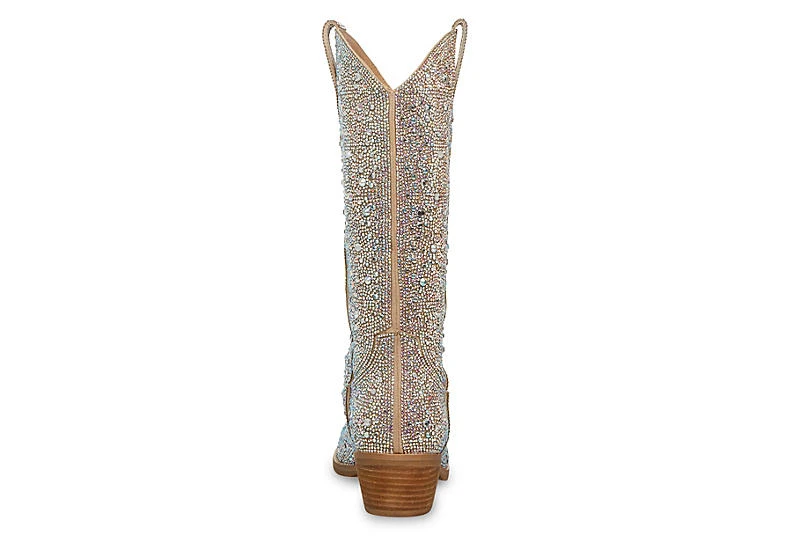 Round up the ranch appeal of the Madden Girl Redford women’s Western boot. With a rhinestone upper featuring an almond toe and different-sized sparkles for added style, these pull-on boots easily complete your sassy look. The synthetic or fabric lining soothes your foot while you enjoy the subtle lift of the 1 3/4″ block heel.